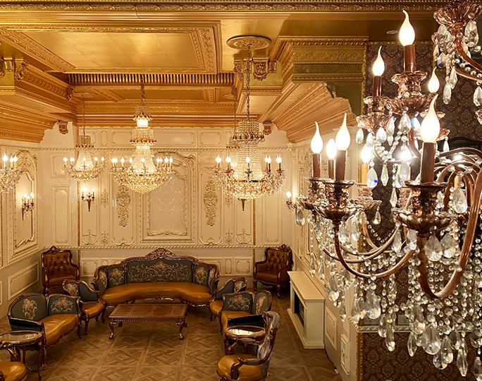 ゴシックな雰囲気が特徴的なレンタル撮影スタジオ。 約100m2の広々空間はイベント会場としても最適。 豪華シャンデリア多数設置 カウンターやDJブースなども完備。